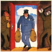 | Das obligatorische Telefonat am Anfang teilt Tom mit, daß die Strauchdiebe Mönk und Schretter von Locke bei einem Diebstahl gesehen wurden. Tom stellt die beiden samt Beute, einem mysteriösen Koffer. Bei einer Meinungsverschiedenheit zwischen Tom und den Langfingern geht der Koffer auf nimmerwiedersehen verloren. Er fliegt über das Brückengeländer in den Fluß, Mönk und Schretter türmen. Was Tom aber noch sehen kann ist, daß der Koffer mit Bargeld vollgestopft war! Der bestohlene Besitzer des Koffers, ein gewisser Raben, bleibt erstaunlich locker als Tom und Nina ihm vom Schicksal seiner Barschaft berichten. Dieses Verhalten kommt beiden spanisch vor, sie können erlauschen, daß der Koffer mit Falschgeld gefüllt war. Desweiteren erfahren sie, daß auch der Proletentoasterchef Lorenz zu der Fälscherbande gehört. Jetzt ist Beschatten angesagt, auch ein Geldkurier der Bank ist Mitglied der Fälscherclique. Der Kurier bringt echtes Geld, dieses wird dann gegen die Blüten eingetauscht. Dann tritt das von Tom Befürchtete ein: Mönk und Schretter erzählen den Fälschern, Tom und Locke hätten die Blüten unterschlagen! Tom soll das Falschgeld wieder brav zurückgeben, er liefert allerdings Makulatur ab, denn die Blüten sind ja bei den Fischen. Zunächst merken die Gangster das nicht, dann schäumen sie vor Wut. Sie wollen Tom und Nina kleinkriegen, bei einem Kaufhausbesuch entgeht Fräulein Rehm nur knapp einem Säureattentat. Tom ist jetzt auch stinksauer, zunächst sucht man Lorenz auf, doch dort wirbelt schon die Polizei. Also halten die beiden sich an Raben. Sie können beobachten, wie Raben Falschgeld übergibt. Dann verfolgen sie ihn bis zu einer Fälscherwerkstatt, dort treffen sie auch den Säureattentäter und Lorenz. Tom lässt sich auf eine Keilerei ein und muß erstmal klein beigeben. Zu allem Überfluß keschern die Falschmünzer auch noch Locke ein, ihr soll nichts passieren, wenn Tom mit den Blüten shoppen geht. So wollen die Gangster Nina und Engelbert mitschuldig machen. Doch die nächste Schlacht gewinnt Tom, mit einem Panthersprung durch das geschlossene Fenster befreit er Locke und macht die Gauner frisch. Das Recht hat wieder mal gesiegt, Lorenz und Konsorten können die nächste Zeit im Bau die Häftlingspostille drucken. Diese Folge kann nicht ganz das Niveau ihrer Vorgängerin halten, die Geschichte ist mir ein bißchen zu straight auf das Ende ausgerichtet, geil ist natürlich Ninas Hinweis auf Theoderich, die Riesendogge! Ich gebe 7 Scheine. [tim] |